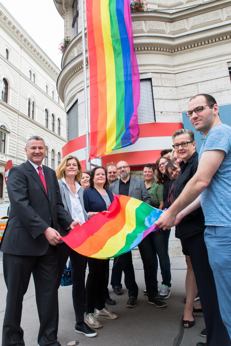 Wien (OTS/SK) – Zu Beginn der Pride-Woche wurde heute, Montag, an der SPÖ-Zentrale traditionell die Regenbogenfahne als Zeichen der Akzeptanz gehisst. „Akzeptanz sollte zum Lebensmotto aller werden“, so der designierte Bundesgeschäftsführer der SPÖ Georg Niedermühlbichler, die Wiener Landesparteisekretärin Sybille Straubinger, die Bundesfrauenfrauengeschäftsführerin Andrea Brunner, die Wiener Frauensekretärin Nicole Berger-Krotsch und der Bundes- und Wiener Landesvorsitzende der Sozialdemokratischen LSBTI-Organisation (SoHo) Peter Traschkowitsch. ****