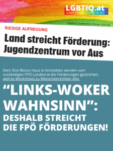 Die komplette Streichung aller Landesförderungen für das Don-Bosco-Jugendheim Amstetten durch FPÖ-Landesrat Martin Antauer sorgt aktuell für heftige Kritik. Besondere Empörung ruft aber nicht nur in Amstetten seine Begründung für diesen jugendpolitischen Kahlschlag hervor: Hatte Antauer anfangs noch die Arbeit des Jugendzentrums gelobt, reagierte er auf die breite Kritik an dieser Kürzung nun mit einer höchst-peinlichen Aussendung, in dem er dem Jugendzentrum „links-woken Wahnsinn“ vorwarf, nachdem es dort in der Vergangenheit neben zahlreichen anderen Events auch Workshops rund um die Themen Vielfalt und LGBTIQ+ gegeben hatte. „Es ist wieder einmal bezeichnend, dass die FPÖ Niederösterreich auf berechtigte Kritik nicht mit Argumenten, sondern einem billigen Vorbild ganz im Stile Trumps und des jüngst abgewählten Victor Orbans reagiert. Ohne jeglichen Zusammenhang wird gegen die LGBTIQ+ Community geschimpft und gehetzt, nur um vom eigenen Totalversagen abzulenken. Fakt ist: Antauer und seiner Partei sind die jungen Menschen in Niederösterreich genauso egal wie diese wichtige Einrichtung bei uns in Amstetten – mit ihrem Kulturkampf können sie davon niemanden ablenken“, betont die Vorsitzende der sozialdemokratischen LGBTIQ+ Organisation SoHo in Niederösterreich und Amstettner SPÖ-Gemeinderätin Birgit Kern.