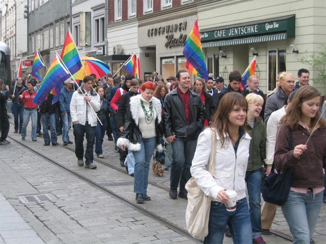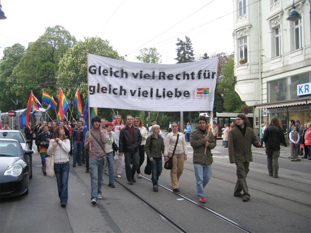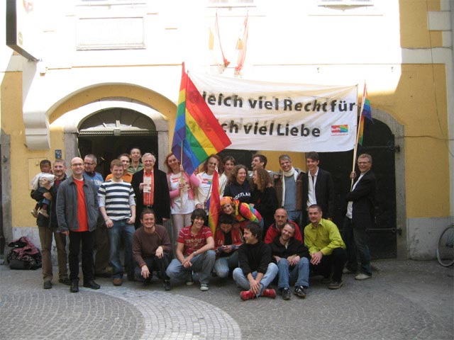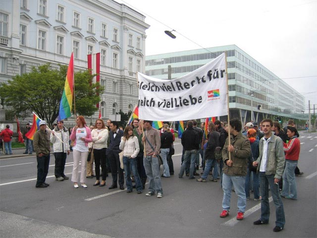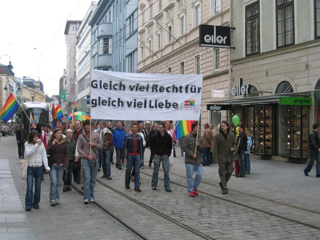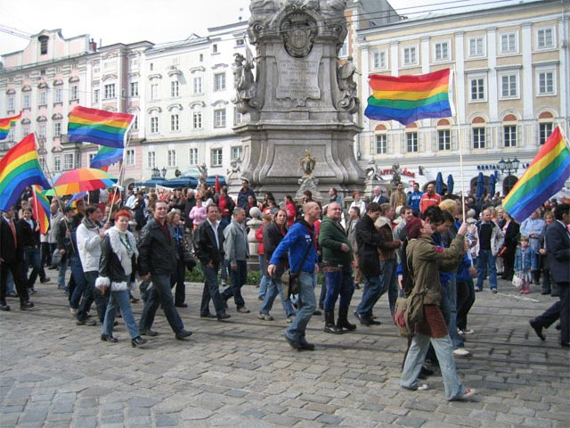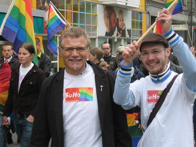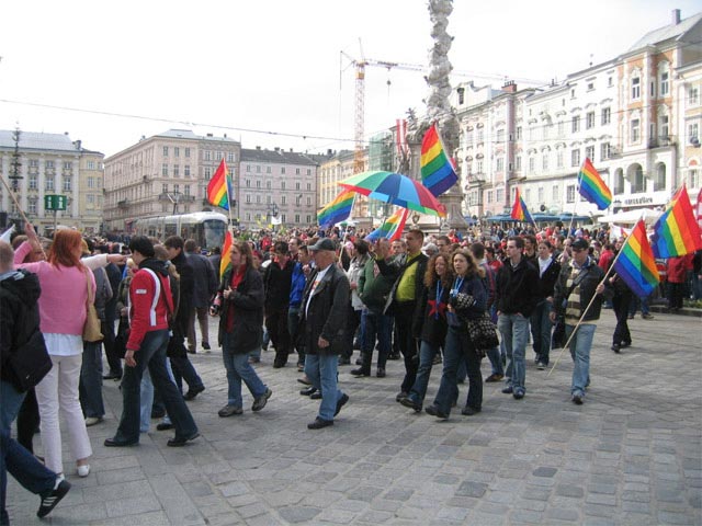Linz 01.05.06 – (SoHo-OOE) – Die SoHo Oberösterreich freut sich bekannt zu geben, dass beim Linzer Maiaufmarsch 60 Lesben, Schwule, Bisexuelle und Transgender-Personen gemeinsam hinter der Regenbogenfahne „Gleich viel Recht für gleich viel Liebe“ forderten! Stadtrat MMag. Klaus Luger (SP), der die Ankommenden am Linzer Hauptplatz mit Grußworten empfing, rief SoHo-Landesvorsitzenden Gerhard Friedinger beim Ankommen am Hauptplatz spontan zu: „Damit ist die Latte für nächstes Jahr hoch gelegt!“
