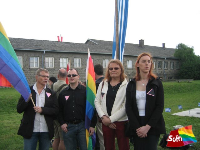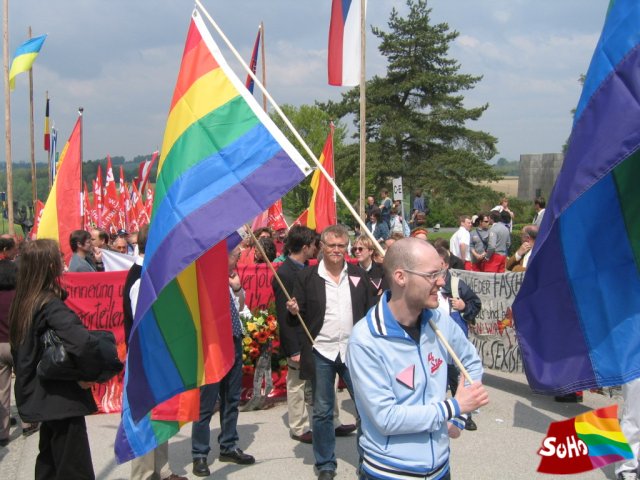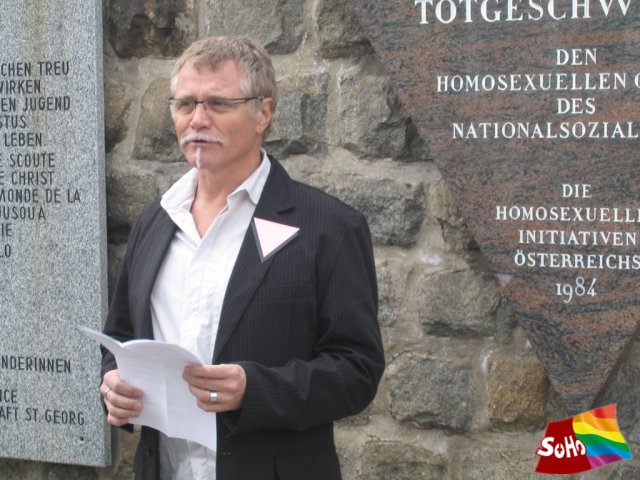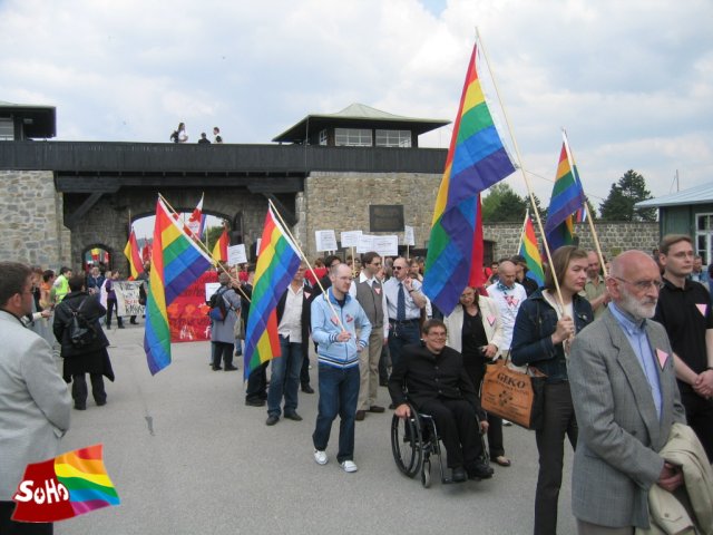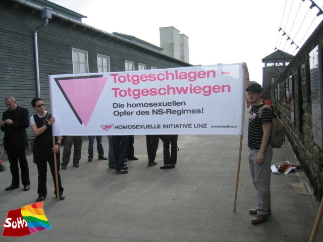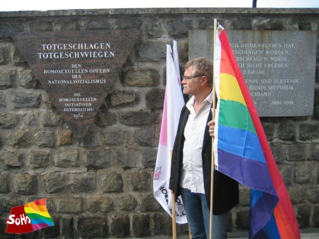 SoHo-OOE: Befreiungsfeier ehem. KZ MauthausenMauthausen 07.05.06 (SoHo-OOE) Die SoHo Oberösterreich nahm am 7. Mai 2006 bei der Befreiungsfeier im ehemaligen KZ Mauthausen gemeinsam mit der HOSI Linz teil. Landesvorsitzender Gerhard Friedinger, der vor dem Gedenkstein eine Rede hielt, unterstrich, dass die Grausamkeiten, die sich während des Nazi-Regimes ereigneten, nicht wiederholen sollten. Und obwohl sich in den 61 Jahren seit der Befreiung für Homosexuelle und Transgender-Personen sehr viel zum Positivem verändert hat, sind wir dennoch nach wie vor „Geduldete“ und nicht gleichberechtigt.