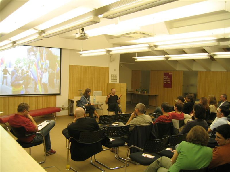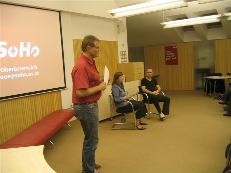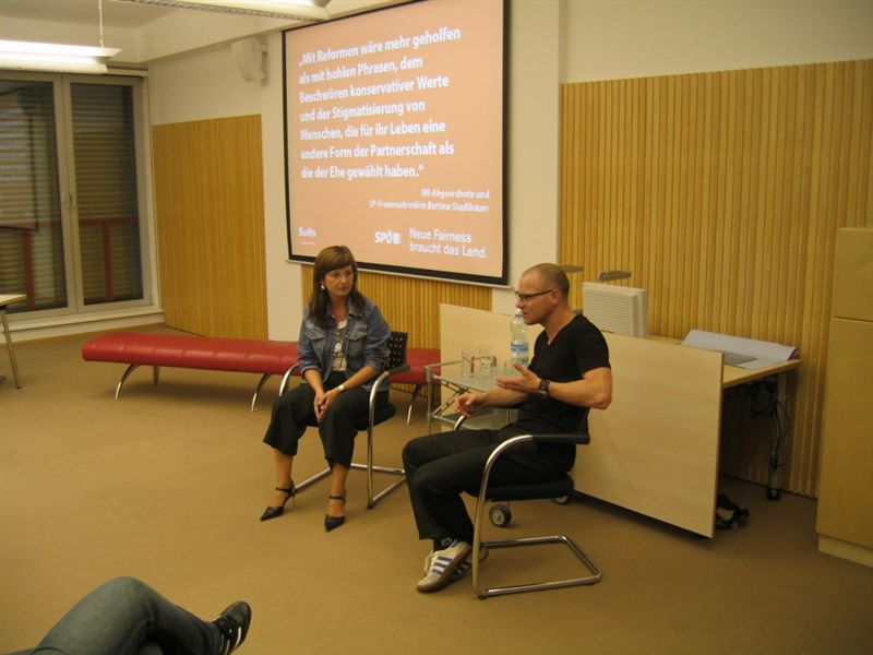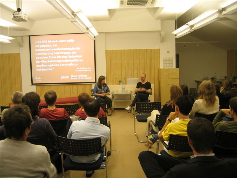 Bereits wenige Minuten nachdem SoHo Landesvorsitzender Gerhard Friedinger die Begrüßungsworte sprach entwickelte sich ein angeregtes Gespräch zwischen Karl Sibelius, seines Wissens nach erster geouteter Homosexueller in Partnerschaft, der ein Kind adoptierte und Bettina Stadlbauer, alleinerziehende Mutter einer mittlerweile 22-jährigen Tochter. In den darauf folgenden 75 Minuten sprach Karl Sibelius über seine Erfahrungen bei der Adoption seiner Tochter Ella, die er gemeinsam mit seinem Partner Rainer aufzieht, jedoch ist dieser rechtlich gesehen zur gemeinsamen Tochter ein Fremder. Bettina Stadlbauer brachte zahlreiche Erfahrungswerte aus ihrem Leben ein und versicherte allen Anwesenden, dass die rechtliche Gelichstellung sowohl Homosexueller als auch Transgender-Personen schwarz-auf-weiß im Wahlprogramm der SPÖ enthalten sei und somit bei einer SP-Regierungsbeteiligung umgesetzt werden soll. Aus dem Publikum kamen immer wieder Fragen wodurch ein weites Spektrum an Informationen und Erfahrungswerten ausgetauscht werden konnten.