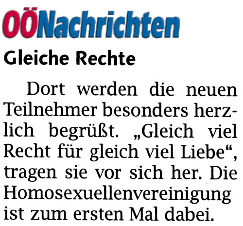 Wir haben gezeigt, dass die lesbischwultransgender Community gemeinsam für unsere Anliegen der vollen Gleichberechtigung in allen Lebensbereichen kämpft und möchten uns bei allen Beteiligten bedanken, nicht nur bei all jenen, die mitgegangen sind, sondern auch bei allen anderen, die uns unterstützt haben, angefangen von der HOSI Linz bishin zu den Linzer Szenelokalen, vorallem aber bei Gregor, Toni und Rudi vom INSAS, die uns mit einem Sektfrühstück empfangen haben!