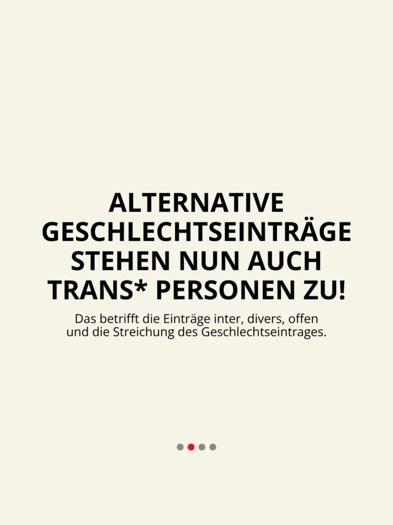 - Seit 31. Jänner 2026 haben trans* Personen die Möglichkeit, neben den Einträgen „männlich“ und „weiblich“ nun auch die „alternativen Geschlechtseinträge“ (inter, divers, offen, kein Eintrag) zu nutzen, um ihre Geschlechtsidentität adäquat zu beschreiben!