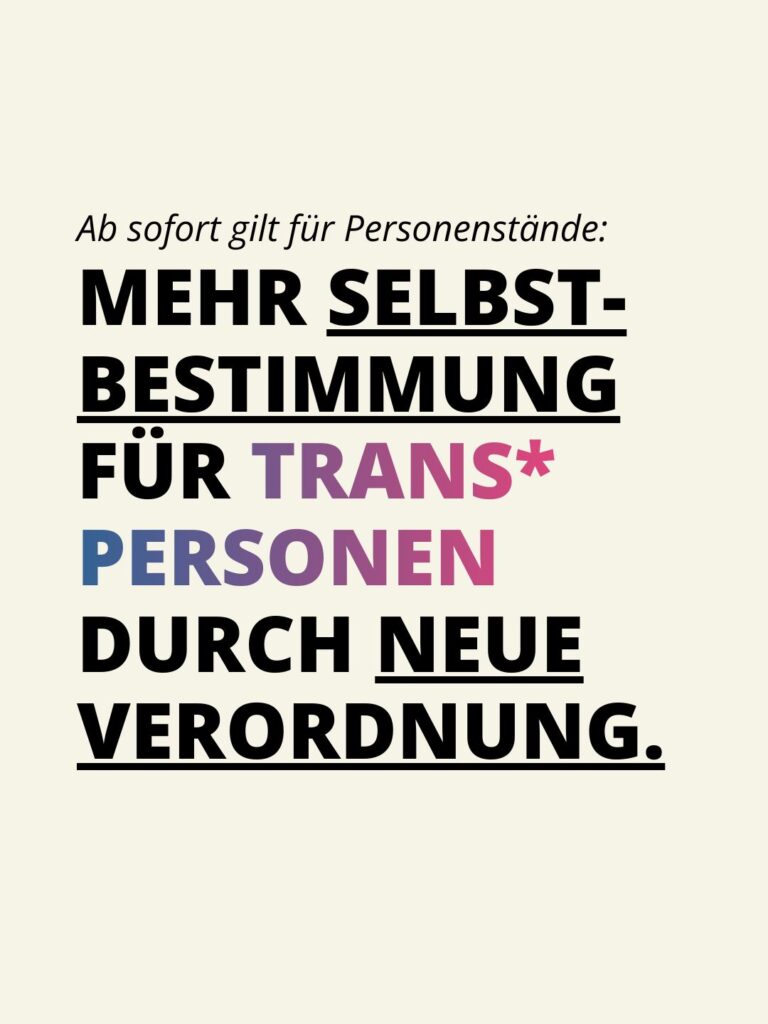 - Das Innenministerium setzt damit auch einen klaren Rechtsstandard für trans* Personen, wobei nicht-binäre Personen als Untergruppe von trans* Personen zu verstehen sind.
