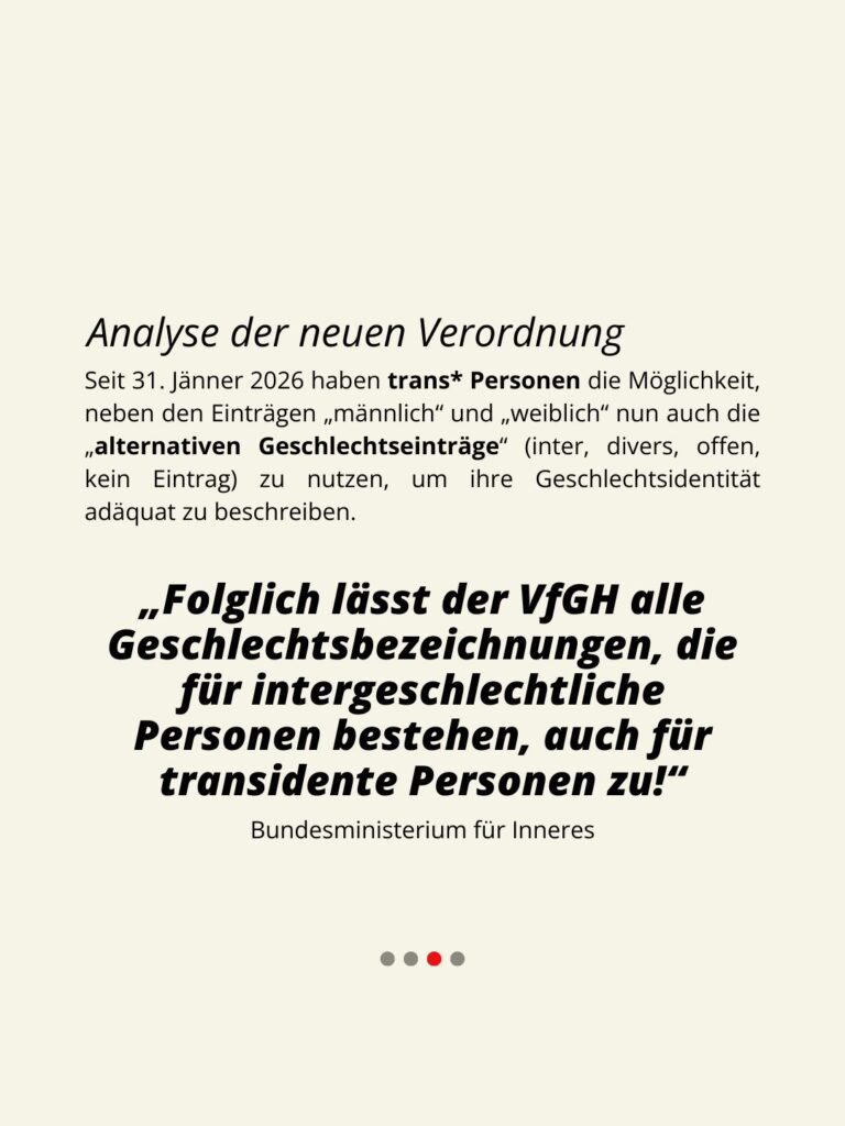 - Diese Neuregelung wurde vom Innenministerium als Reaktion auf den aktuellen VfGH-Entscheid (E 1297/2025, 18.12.2025) erlassen, durch den nicht-binäre Personen das Recht auf Streichung ihres Geschlechtseintrags erhalten haben. Das Ministerium erkennt damit an, dass der VfGH höchstwahrscheinlich weitere Öffnungsschritte setzen wird, nimmt diese aktiv vorweg und erlaubt für trans* Personen auf jene Geschlechtseinträge zuzugreifen, die es bisher nur für intergeschlechtliche Personen gegeben hat.