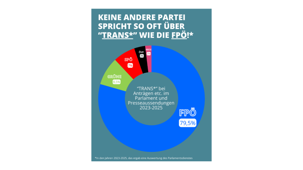 Von 233 parlamentarischen Aktivitäten rund um’s Thema „Transgender“ stammten in diesem Zeitraum insgesamt 144 von der FPÖ – also mehr als die Hälfte. 144-Mal beschäftigte sich die FPÖ also mit einer Personengruppe, die weniger als ein Prozent der Bevölkerung ausmacht. Den Höhepunkt stellt dabei das Jahr 2025 dar, in dem sich die FPÖ 50-Mal mit diesem Thema beschäftigte, im Gegensatz zu 5 Initiativen der Grünen, 3 der ÖVP und je 2 von SPÖ sowie NEOS. Im Wahlkampfjahr 2024 gab es in diesem Themenbereich 36 parlamentarische Initiativen aus dem freiheitlichen Lager, eine von den Grünen und keine einzige von ÖVP, SPÖ und NEOS.
